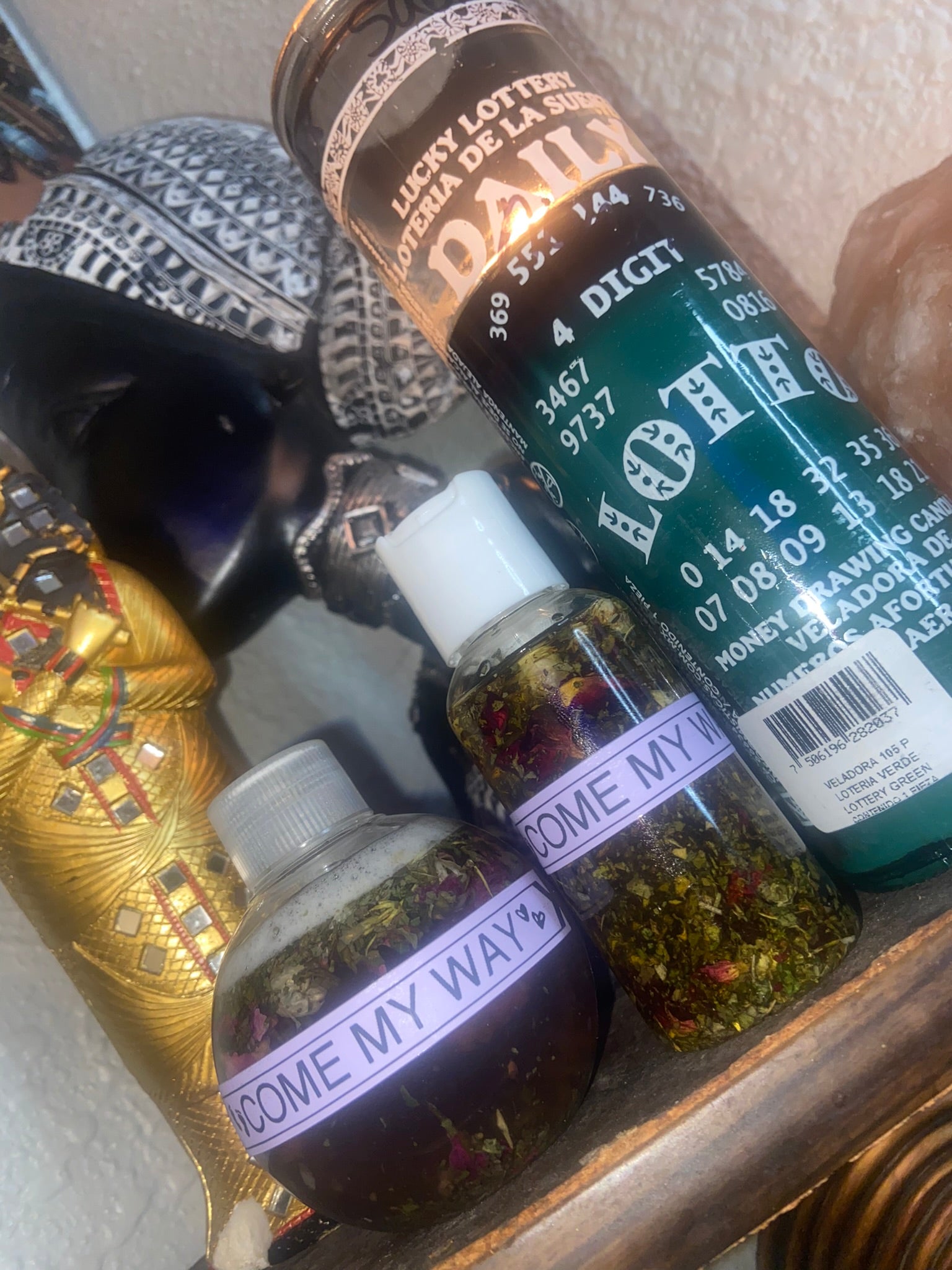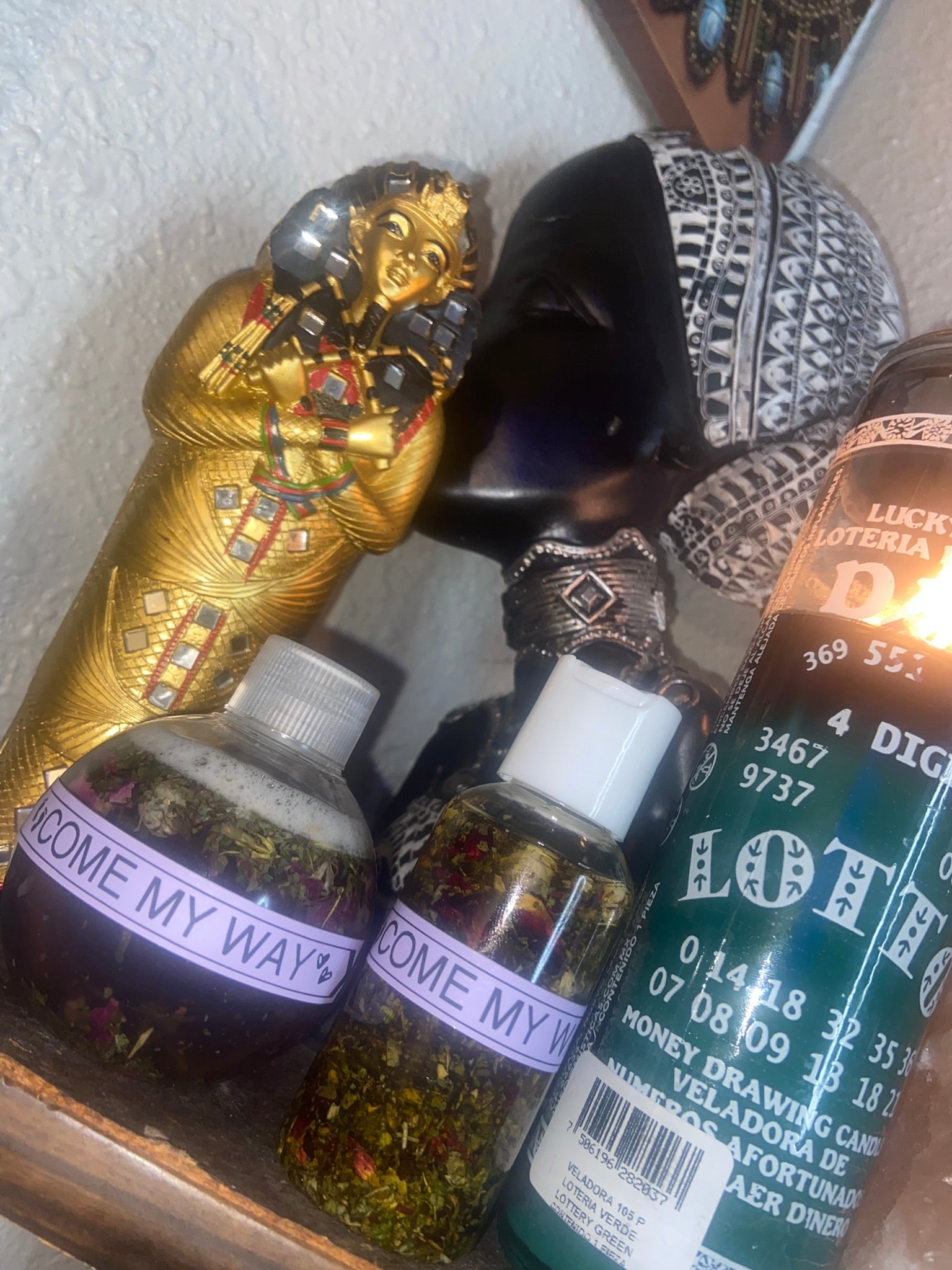 The come way way bundle is a love attracting wash & oil. This is good with self love & attracting love outside of self, genuinely! Also helps heal & balance your HEART CHAKRA! When you purchase this product it comes with a FREE spiritual bath prepared divinely for you! Instructions included!